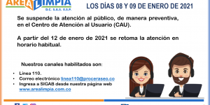 ¡Atención! 📢 Informamos a todos nuestros usuarios que los días 08 y 09 de enero de 2021 se suspende la atención al público en el Centro de Atención al Usuario …