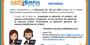 Se suspende atención al usuario Continuamos tomando las medidas preventivas para mitigar el riesgo y controlar los efectos del COVID -19, según lo establecido por la Alcaldía Mayor de Bogotá …