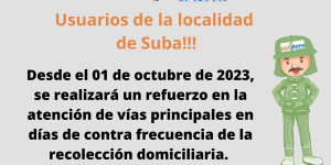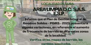 Estimados Usuarios de Suba, Área Limpia Distrito Capital S.A.S E.S.P, contribuye con el mejoramiento del entorno urbano y las condiciones de habitabilidad de las comunidades a través de la prestación …
