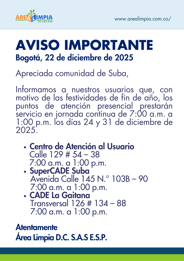 Cambios atención presencial 24 y 31 de diciembre 2025 Públicado en 23 diciembre, 202523 diciembre, 2025 por AreaLimpiaBogotaSuba