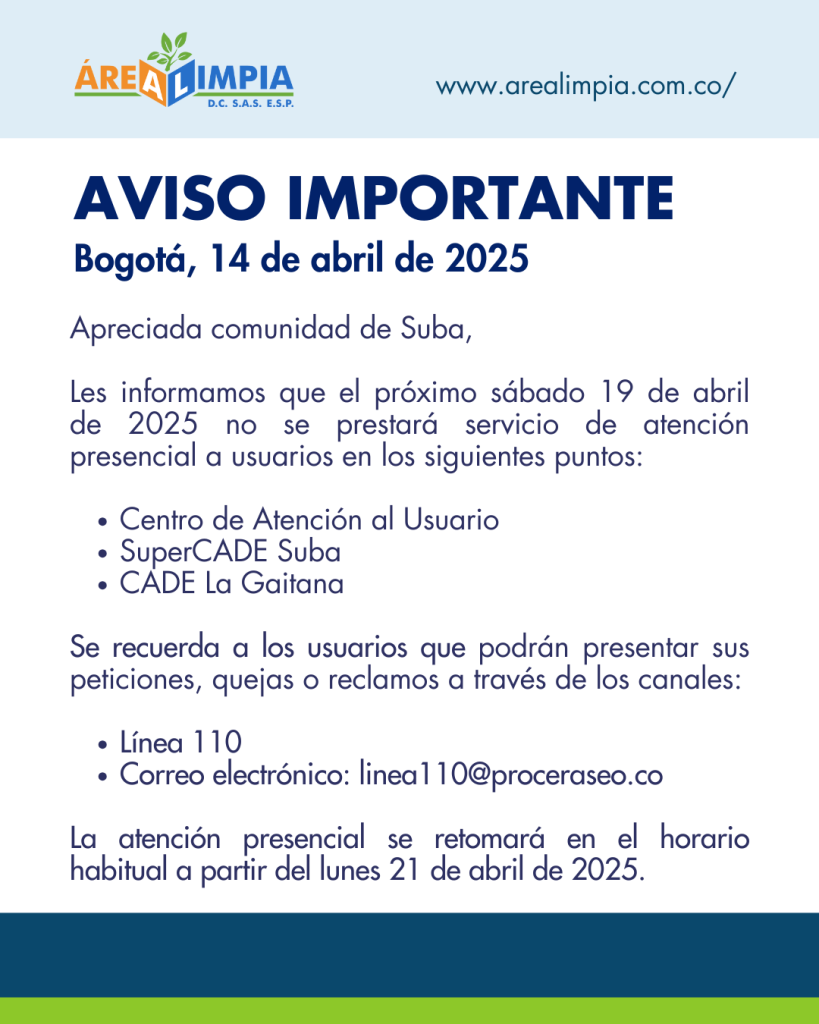 Cambios atención presencial Sábado 19 de abril 2025 Públicado en 14 abril, 202514 abril, 2025 por Camilo Ardila
