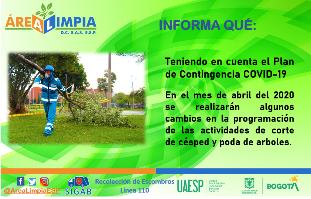 La empresa Área Limpia D.C. S.A.S E.S.P ratifica su firme compromiso con el cumplimiento normativo y teniendo en cuenta la situación actual de emergencia por el COVID-19; esta actividad, se realizará de conformidad con lo autorizado en el Plan de Podas para la localidad de Suba, priorizando el arbolado que fue identificado y evaluado en la categoría de alto riesgo de volcamiento (información suministrada por la Secretaria Distrital de Ambiente). Así mismo, se contará con personal para la atención inmediata de emergencias que tengan lugar por riesgo inminente de caída de ramas, ya sea por la temporada invernal o por características propias de los árboles.