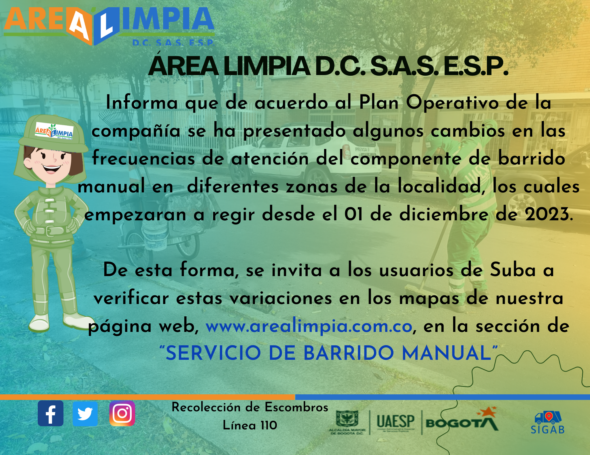 Se informa a nuestros usuarios de la localidad de Suba que de acuerdo al Plan Operativo de la compañía se ha presentado algunos cambios en las frecuencias de atención del componente de barrido manual en diferentes zonas de la localidad, los cuales empezaran a regir desde el 01 de diciembre de 2023.