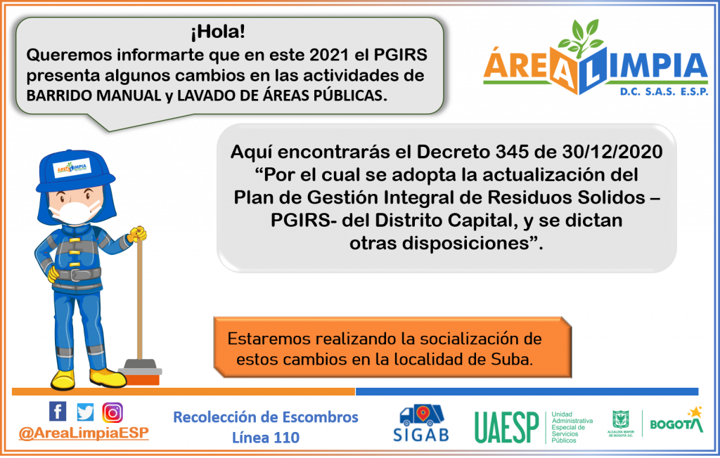 ¡Atención! Informamos a nuestros usuarios que el PGIRS 2021 presenta algunos cambios en las actividades de BARRIDO MANUAL y LAVADO DE ÁREAS PÚBLICAS.