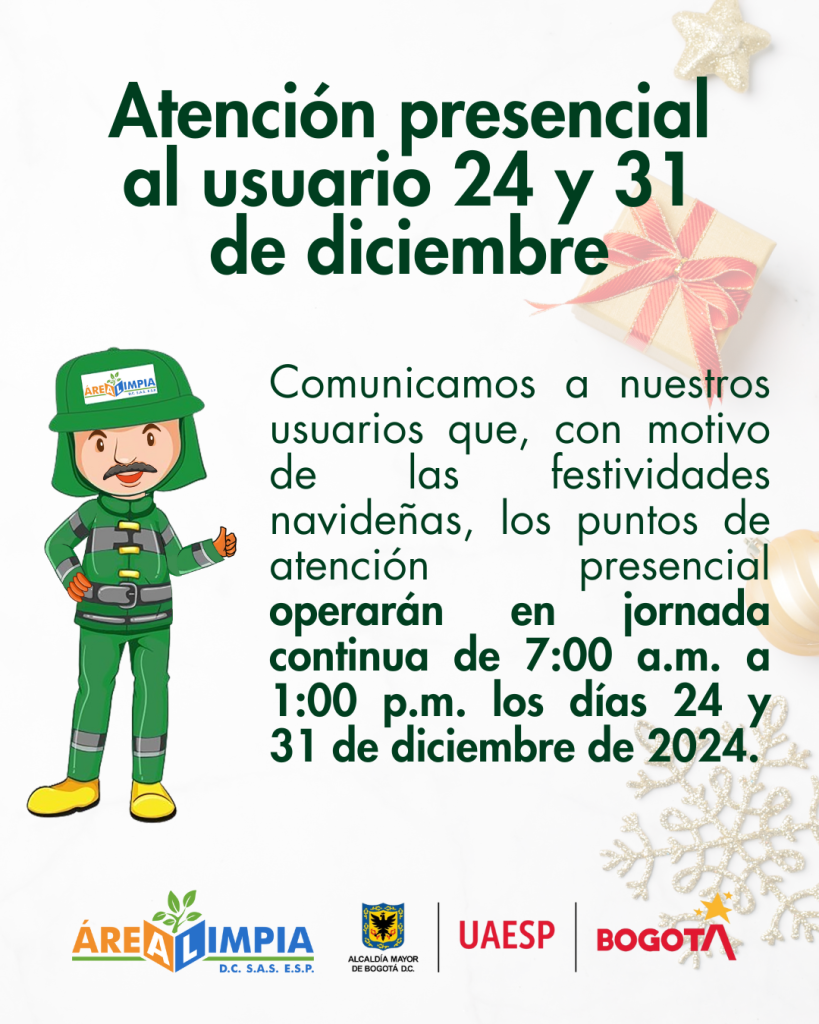 Comunicamos a nuestros usuarios que, con motivo de las festividades, los puntos de atención presencial operarán en jornada continua de 7:00 a.m. a 1:00 p.m. los días 24 y 31 de diciembre de 2024.