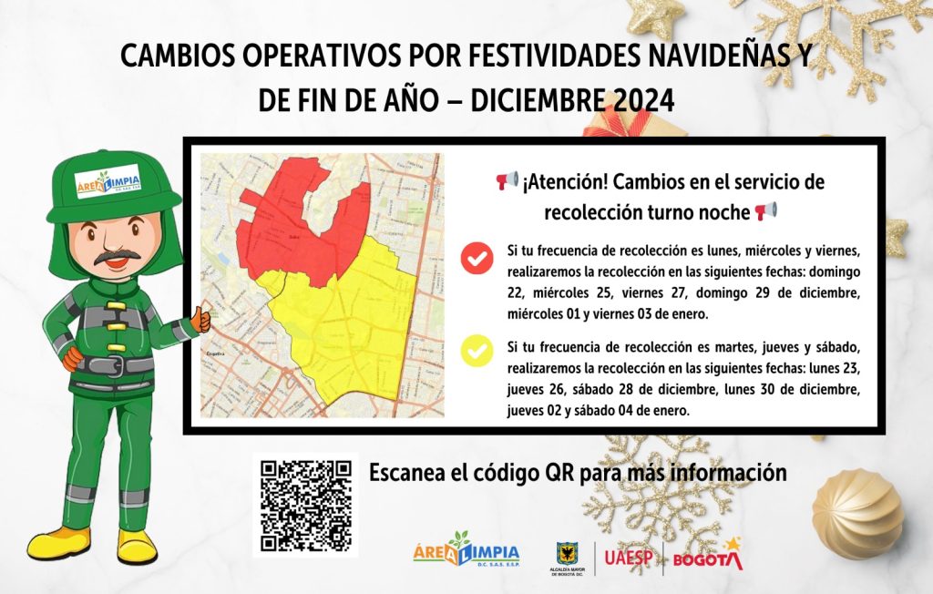 En aras de garantizar el reglamento técnico operativo para la prestación del servicio público de aseo en la ciudad de Bogotá D.C., por medio del presente informamos a ustedes sobre los ajustes que se implementarán durante el mes de diciembre de 2024.