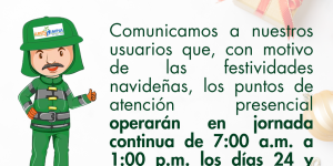Comunicamos a nuestros usuarios que, con motivo de las festividades, los puntos de atención presencial operarán en jornada continua de 7:00 a.m. a 1:00 p.m. los días 24 y 31 …