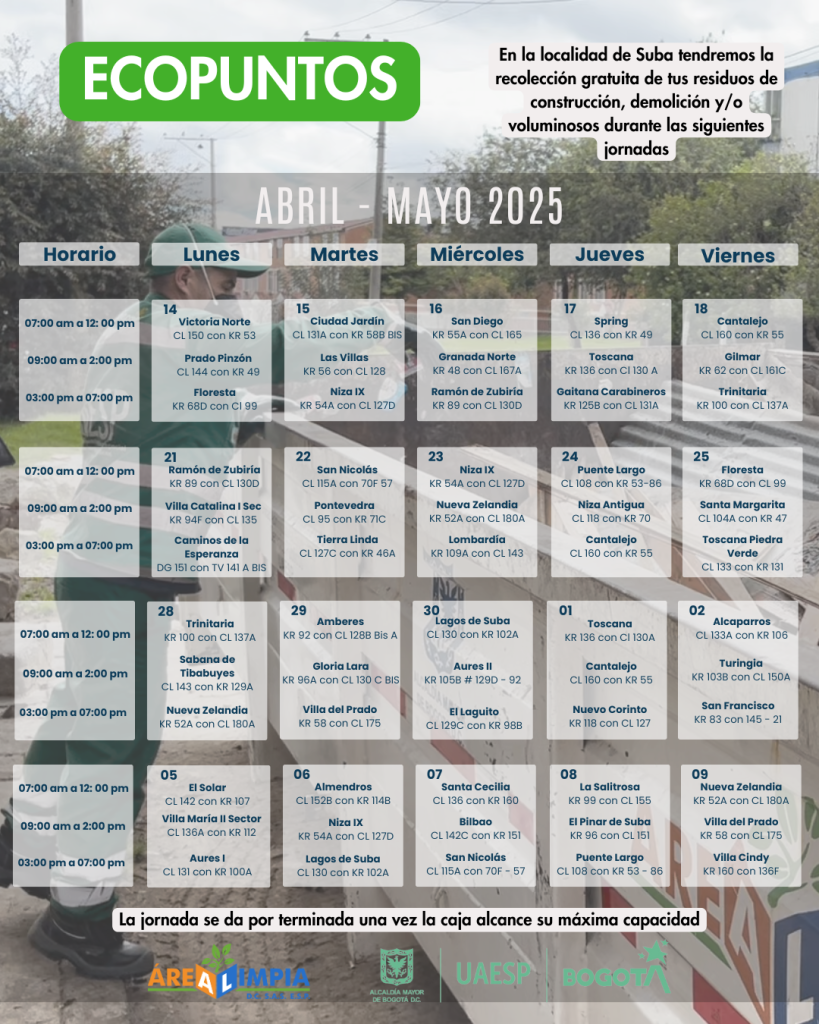 Cronograma Ecopuntos Abril 2025 – Mayo 2025 Públicado en 11 abril, 202511 abril, 2025 por Camilo Ardila Estimada comunidad de Suba, a continuación presentamos la ubicación de los Ecopuntos de Abril 2025 a Mayo 2025 que hemos preparado para la recolección gratuita de residuos de construcción, demolición y voluminosos.