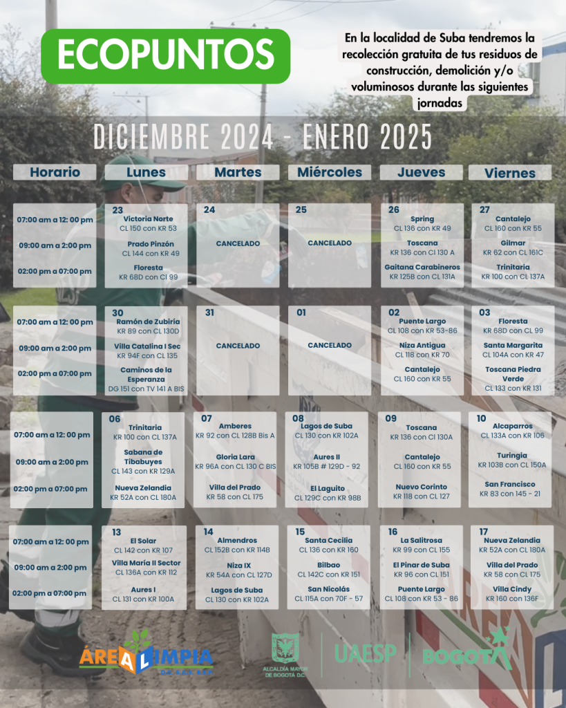 Estimada comunidad de Suba, a continuación presentamos la ubicación de los Ecopuntos de diciembre 2024 a enero 2025 que hemos preparado para la recolección gratuita de residuos de construcción, demolición y voluminosos.