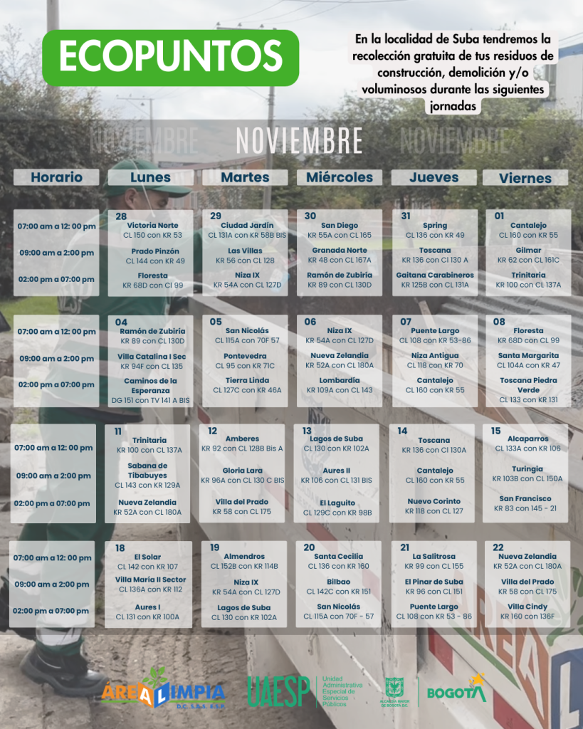 Cronograma Ecopuntos Noviembre 2024 Públicado en 27 octubre, 202427 octubre, 2024 por Camilo Ardila Estimada comunidad de Suba, a continuación presentamos la ubicación de los Ecopuntos de noviembre que hemos preparado para la recolección gratuita de residuos de construcción, demolición y voluminosos.