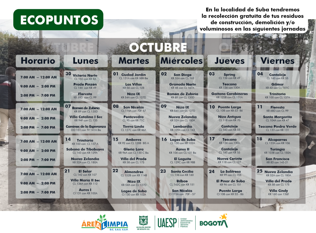 Cronograma Ecopuntos Octubre 2024 Públicado en 27 septiembre, 202427 septiembre, 2024 por Camilo Ardila Estimada comunidad de Suba, a continuación presentamos la ubicación de los Ecopuntos de octubre que hemos preparado para la recolección gratuita de residuos de construcción, demolición y voluminosos.