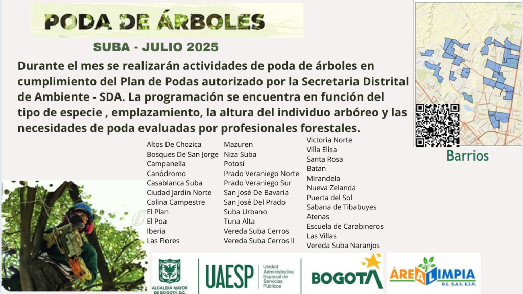 PODA DE ÁRBOLES – JULIO 2025 Públicado en 26 junio, 202526 junio, 2025 por Camilo Ardila Apreciados usuarios de la localidad de Suba, compartimos con ustedes la programación de los barrios donde estaremos en el mes de julio, realizando la actividad del servicio de Poda de Árboles.