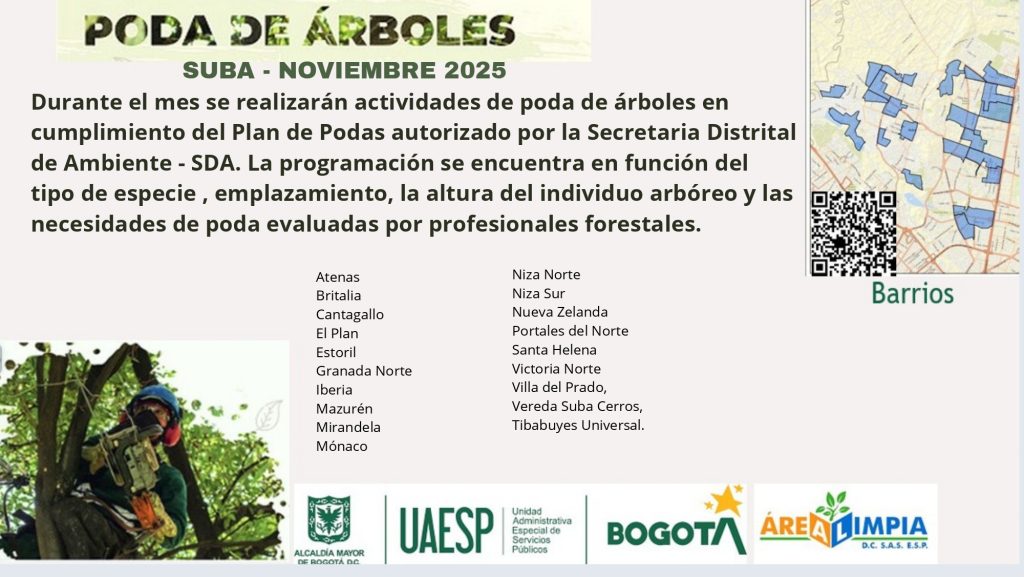 PODA DE ÁRBOLES – NOVIEMBRE 2025 Públicado en 21 noviembre, 202521 noviembre, 2025 por AreaLimpiaBogotaSuba Apreciados usuarios de la localidad de Suba, compartimos con ustedes la programación de los barrios donde estaremos en el mes de noviembre, realizando la actividad del servicio de Poda de Árboles.