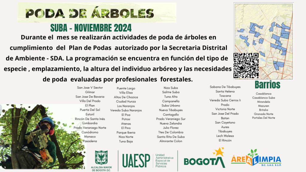 Apreciados usuarios de la localidad de Suba, compartimos con ustedes la programación de los barrios donde estaremos en el mes de noviembre, realizando la actividad del servicio de Poda de Árboles.