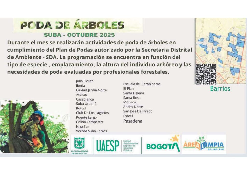 PODA DE ÁRBOLES – OCTUBRE 2025 Públicado en 29 septiembre, 2025 por Camilo Ardila Apreciados usuarios de la localidad de Suba, compartimos con ustedes la programación de los barrios donde estaremos en el mes de octubre, realizando la actividad del servicio de Poda de Árboles.