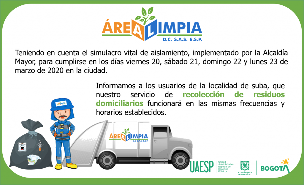 Informamos a todos nuestros usuarios que, teniendo en cuenta el #SimulacroVital de aislamiento implementado por la Alcaldía de Bogotá, el servicio de recolección de residuos domiciliarios funcionará este fin de semana de manera normal y sin ninguna novedad. #SubaLimpia