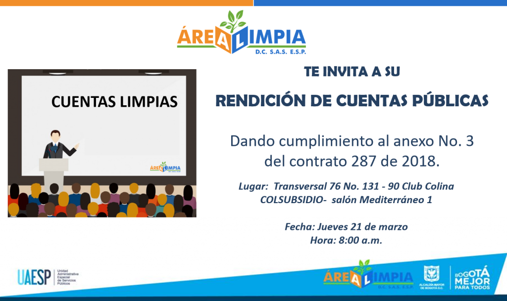 Rendición de cuentas Públicado en 17 junio, 202017 junio, 2020 por AreaLimpiaBogotaSuba Rendición de cuentas Dando cumplimiento al anexo No. 3 del contrato 287 de 2018.