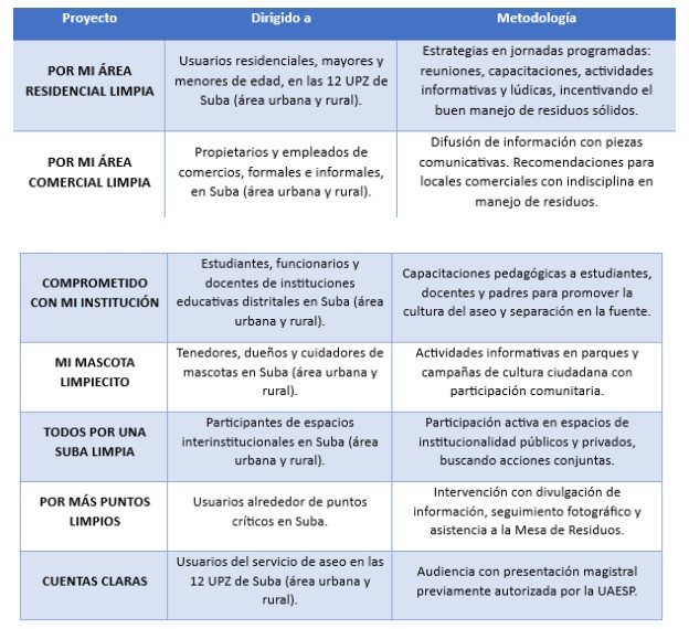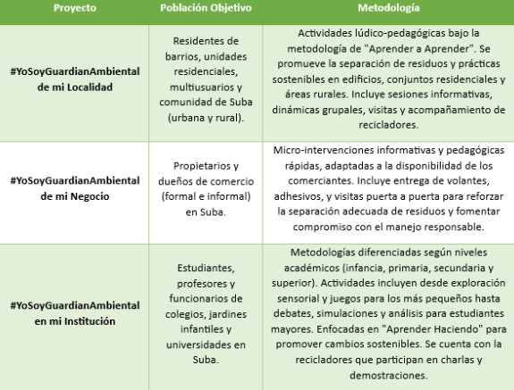 Su objetivo central es fortalecer el rol de los recicladores en Suba a través de procesos educativos que incentiven la cultura del aseo y el aprovechamiento responsable.
